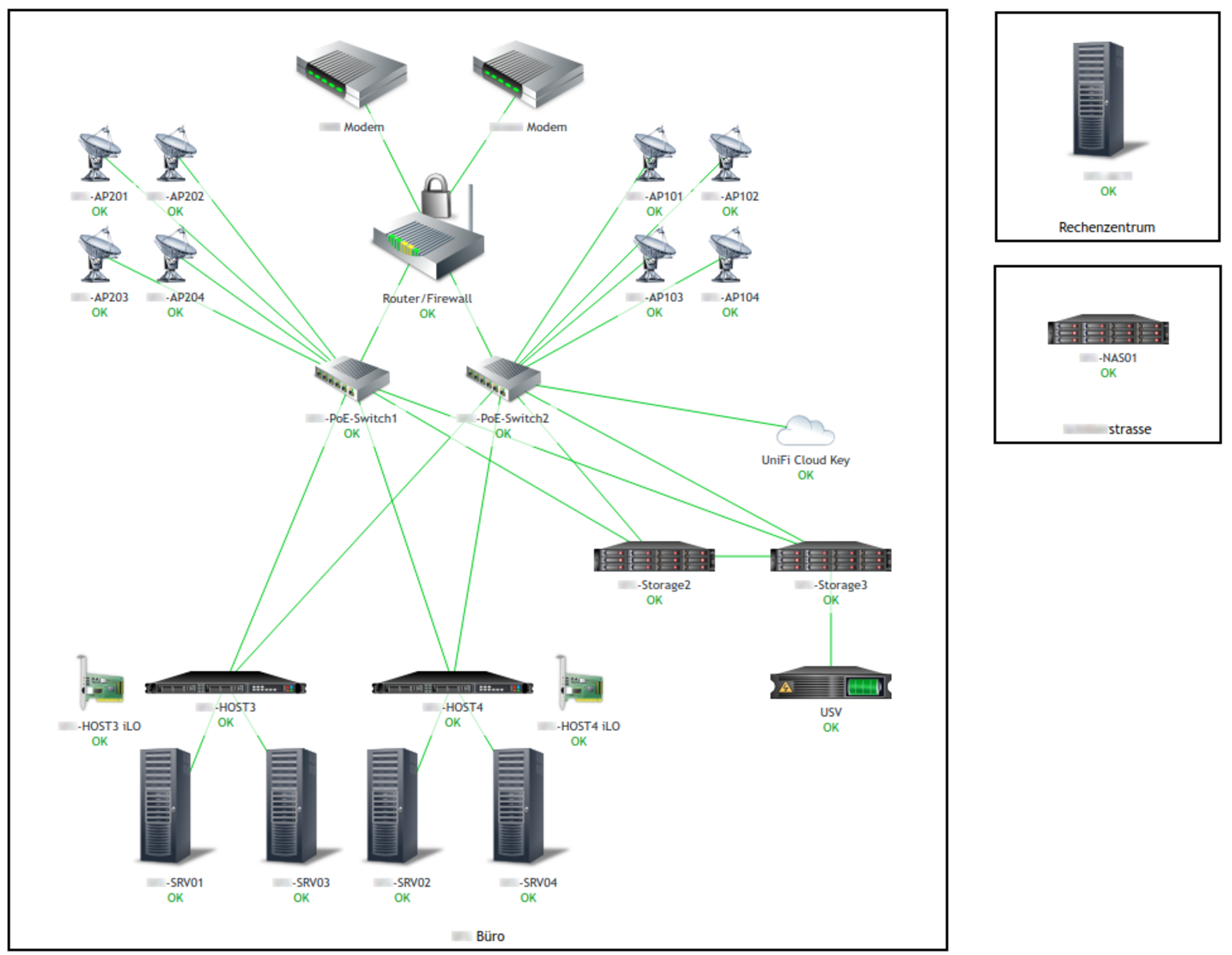 - Darstellung der Netzwerktopologie mit Echtzeit-Status und Direktaufruf von hinterlegten Systemen